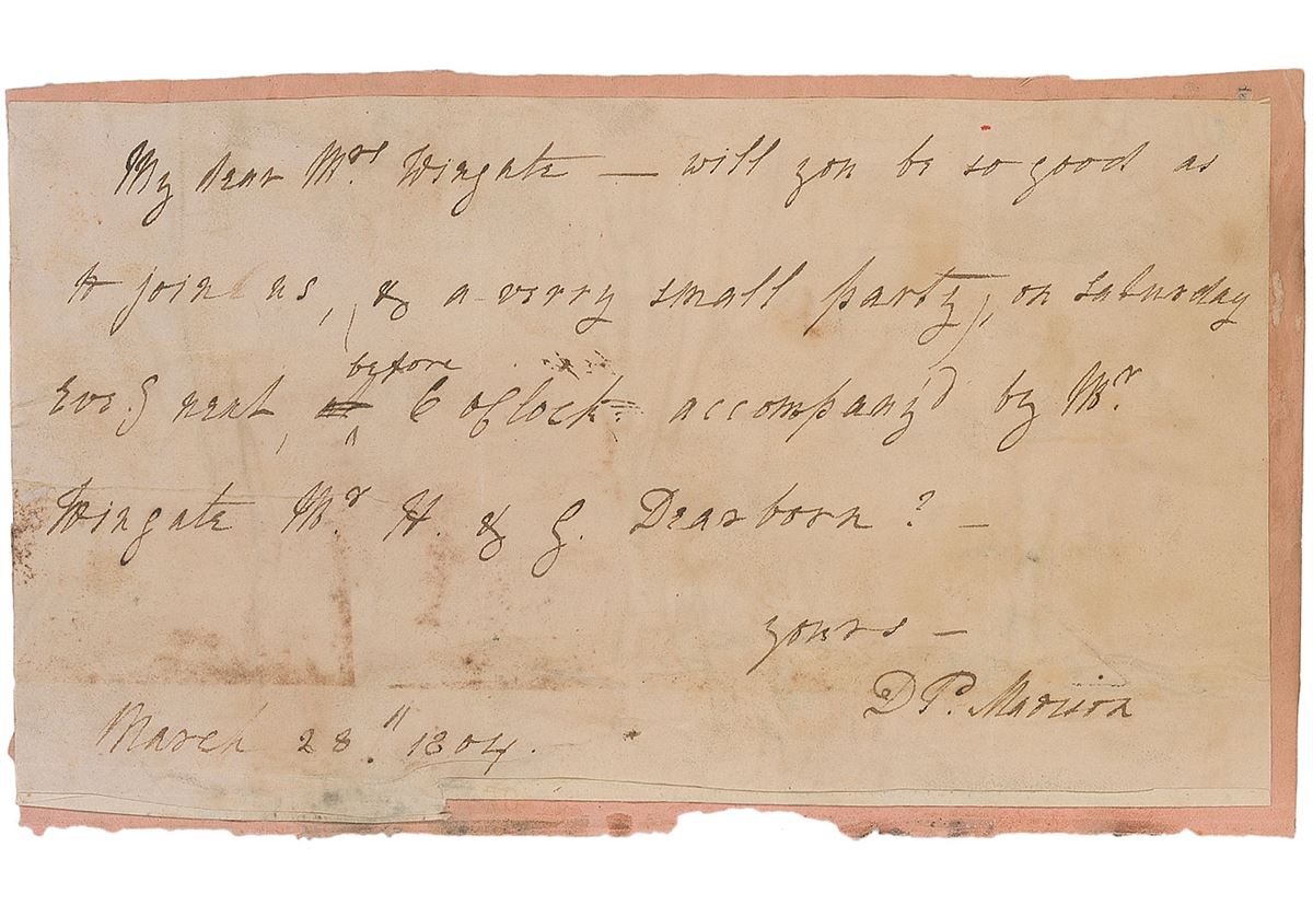 ALS signed “D. P. Madison,” one page, 8 x 4.5, March 28, 1804. Letter of invitation to Mrs. Wingate, in full: “Will you be so good as to join us & a very small party, on Saturday eve.g next before 6 o’clock accompany’d by Mr. Wingate & Mr. H. & G. Dearborn?” Letter is affixed to a slightly larger pink sheet. In very good condition, with overall rippling from dampness, a horizontal fold (passing through the top of the signature), scattered toning and soiling, and some light dampstaining.
