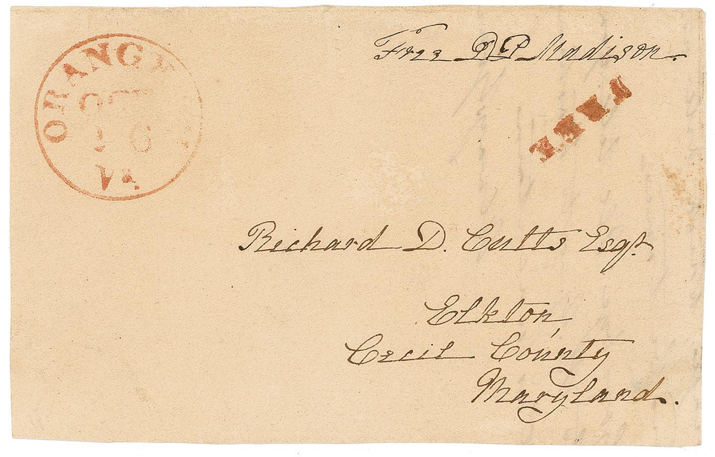 Scarce hand-addressed free franked address panel, 5 x 3.25, addressed in Madison’s hand to “Richard D. Cutts, Esq., Elkton, Cecil County, Maryland,” and franked in the upper right, “Free D. P. Madison.” Panel also bears an Orange, Virginia postmark as well as a “Free” stamp under signature. In fine condition, with lightly trimmed edges, some scattered mild toning and foxing, and light show-through from text on reverse. Dolley’s text is precise and crisply penned.