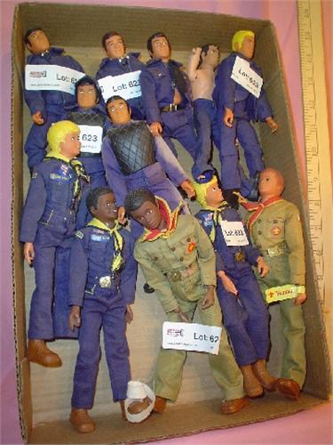 12 Hard Plastic Guy Dolls: Swat, Emergency, Boy Scouts Etc. One has missing hand & foot. One has missing leg from knee down. Marked: LJN Toys Ltd., "The Rookies Terry", Eemergency Roy", "Emergency ? Resembles Dr. Bracken", Mego Corp., "Swat Dominic Luca", Kenner Prod., 1974 Kenner