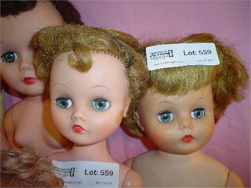 9 Tall Dolls: Vinyl/Plastic. Most Unclothed. All Moveable Eyes (Some Work/Some Don't) Marked on Backs of Heads & Backs "Uneeda Doll Co. 1967-17-11" (This one has hair net on & detached Right arm), "Deluxe Reading Corp. 1964-27", "I.M.C.O." (This one has a tough head of hair), "P", "20HH/20BALHH", "21HH", "34AE-8" & 2 are Unmarked