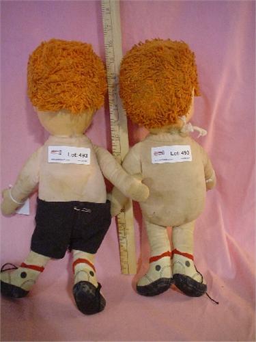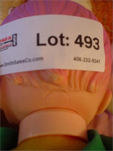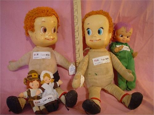 5 Dolls: 1)2 Small Ragdolls by Hallmark (Boy/Girl) Pilgrims #5265 & #64141. 2)Green Jumpsuit. Soft Styrafoam Body/Rubber Head w/Purple Hair. Back of Head says Uneeda Doll Co.-17. 3)"Matty The Talking Boy" by Mattel (2) Dolls. Stuffed Cloth Bodies & Plastic Heads w/Orange "Rug" hair (One w/black shorts is missing talking string. Other one has string & Does Work!. When you pull the string, he really Talks!