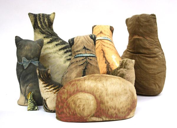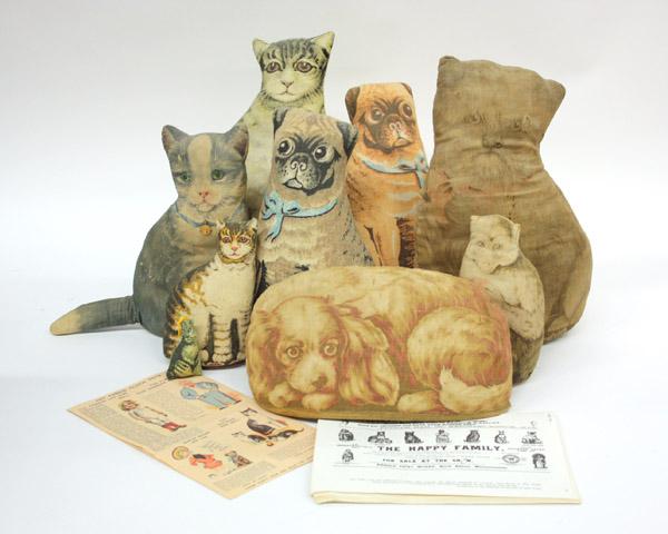 (lot of 9) Five Arnold Print Works ''life size'' stuffed dolls, late 19th century, including ''Tatters'' the terrier, ''Tabby'' the cat, ''Bow-wow'' the pug, ''Chico'' the monkey, and a Cocker Spaniel; together with four reproduction stuffed dolls including two cats, a pug, and a bunny