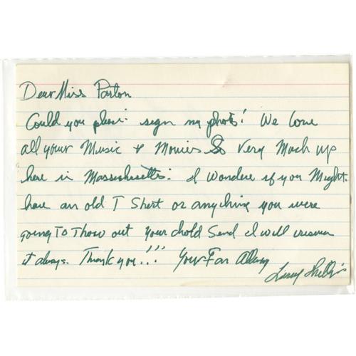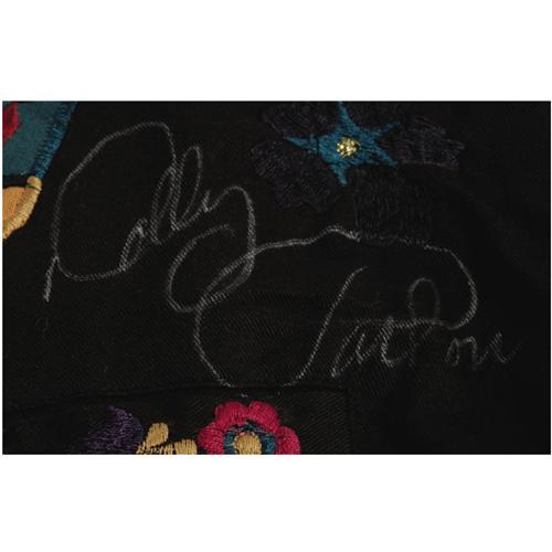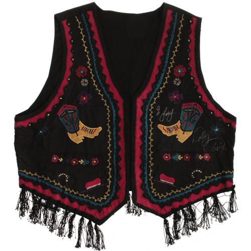 <B>Dolly Parton Signed Vest.</B></I> A black vest with Western motif and fringe, inscribed and signed on the left side by Parton in silver marker. Also included is a handwritten and signed reply by Parton on the back of a letter to her from the recipient of the vest. Both are in Excellent condition.<I>From the Robert Johnson Memorabilia Collection.</B></I><BR><BR><b>Shipping:</b> Clothing, Costumes & Jerseys (<a target="_blank" href="http://www.heritageauctions.com/common/shipping.php">view shipping information</a>) <BR><BR><B>Important not