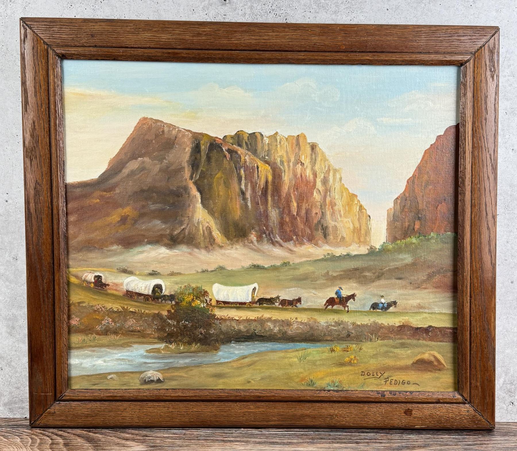 Title is Overland Trail. 20" by 24" unframed. 24" by 28" framed. Oil on Board.