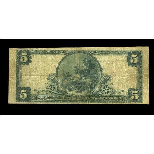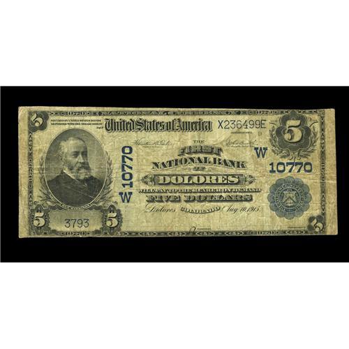 <B>Dolores, CO</B></I> - $5 1902 Plain Back Fr. 606 <B>The First NB</B></I> Ch. # (W)10770<BR>An excessively rare note from the only issuer in this small Montezuma County locale. The bank issued large $5 examples only before bowing out in 1927, with the census showing just three pieces extant, including this note. Our records show that all three have been ensconced in collections for many years, with the last (and only) public offering in over six decades coming back in 1987. <B>About Fine,</B></I> a real rarity from one of the most avidly collected states in the country.