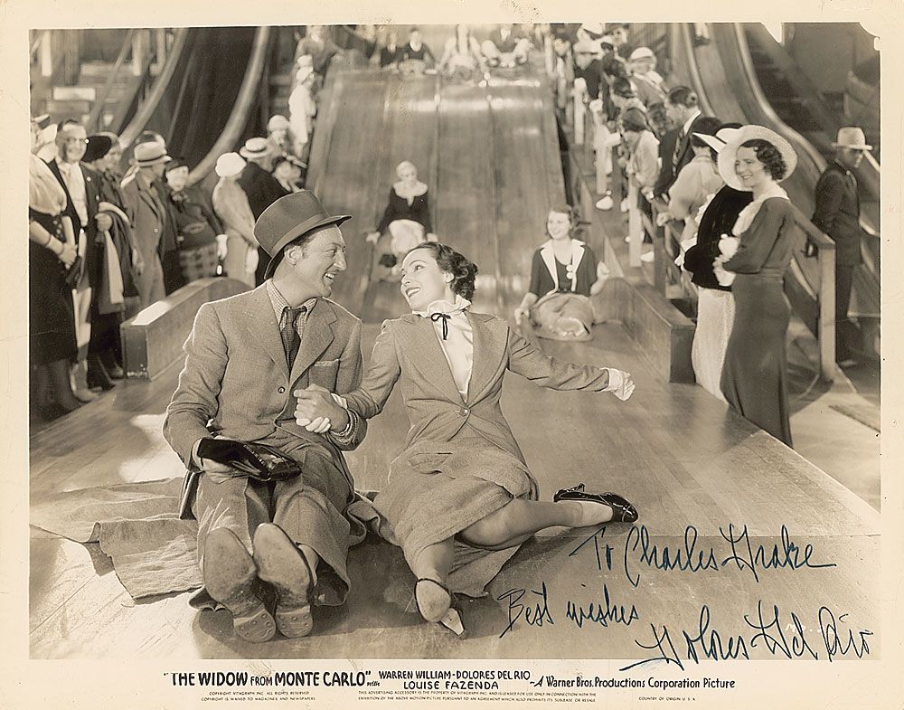 Glossy 10 x 8 Warner Bros. promotional photo for The Widow from Monte Carlo, signed and inscribed in black felt tip, “To Charles Drake, Best wishes, Dolores Del Rio.” In fine condition, with light scattered creases.