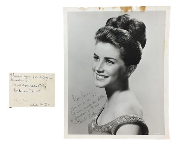 An autograph by Dolores Hart star of the film Where the Boys Are. Atlanta Georgia with a special message “Thank you for all your kindness…” An embossed stamp is The Exotic Garden Inc. (approx. 3 1 /2’ x 3”) . Some ink smudges and normal wear and tear. In good condition.