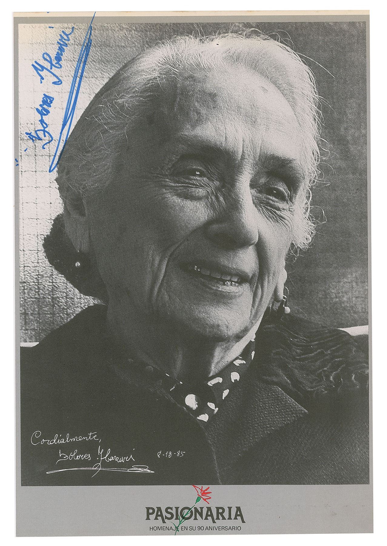Spanish communist politician (1895-1989) and a leader of the Spanish Civil War. Oversized 8.25 x 12 program photo honoring the 90th birthday of 'La Pasionaria,' signed at the top in blue felt tip. In fine condition.