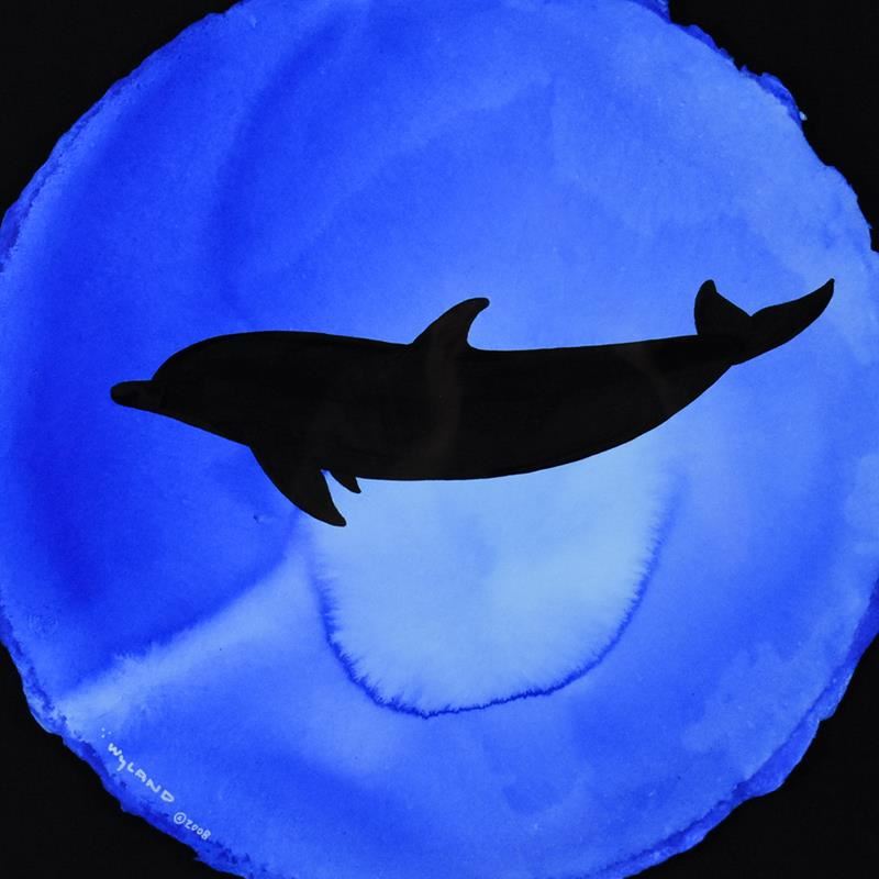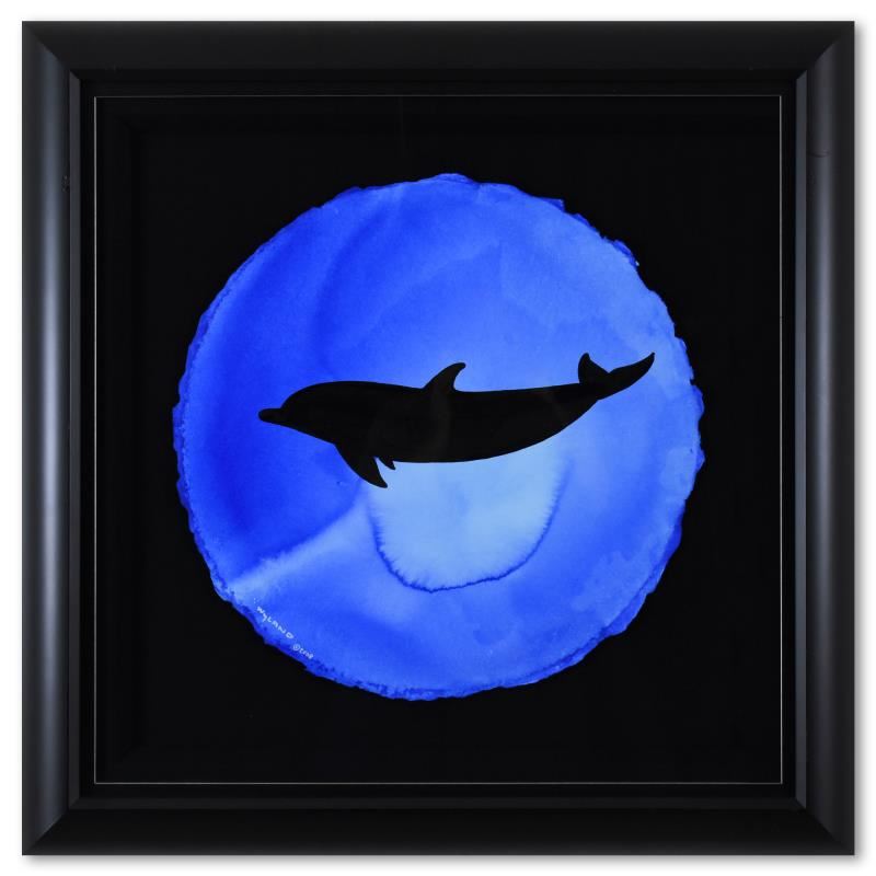 "Dolphin Abstract" is an original watercolor painting on deckle edge paper by Wyland, hand signed by the artist. This piece comes framed. Includes Letter of Authenticity. Measures approx. 30" x 30" (framed), 18" x 18" (image-diameter). ** Please note: There is some wear on the corners and edges of the frame. **