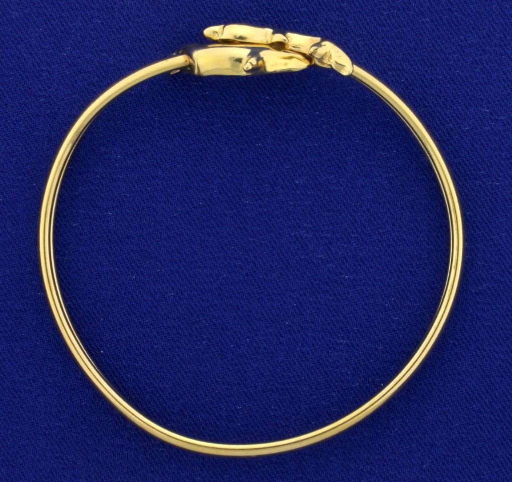 In 14k yellow gold. 2 1/4" diameter. Bangle opens for easy putting on/taking off. 3.5mm wide. 9.3g.