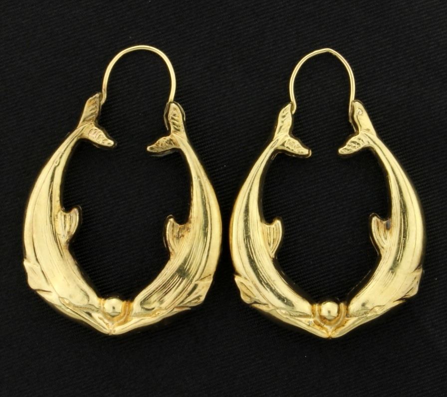 They are 14K yellow gold and are 1 1/2 inches long. They have great detail-one earring has a few indentations that are hardly noticeable. 3.9g