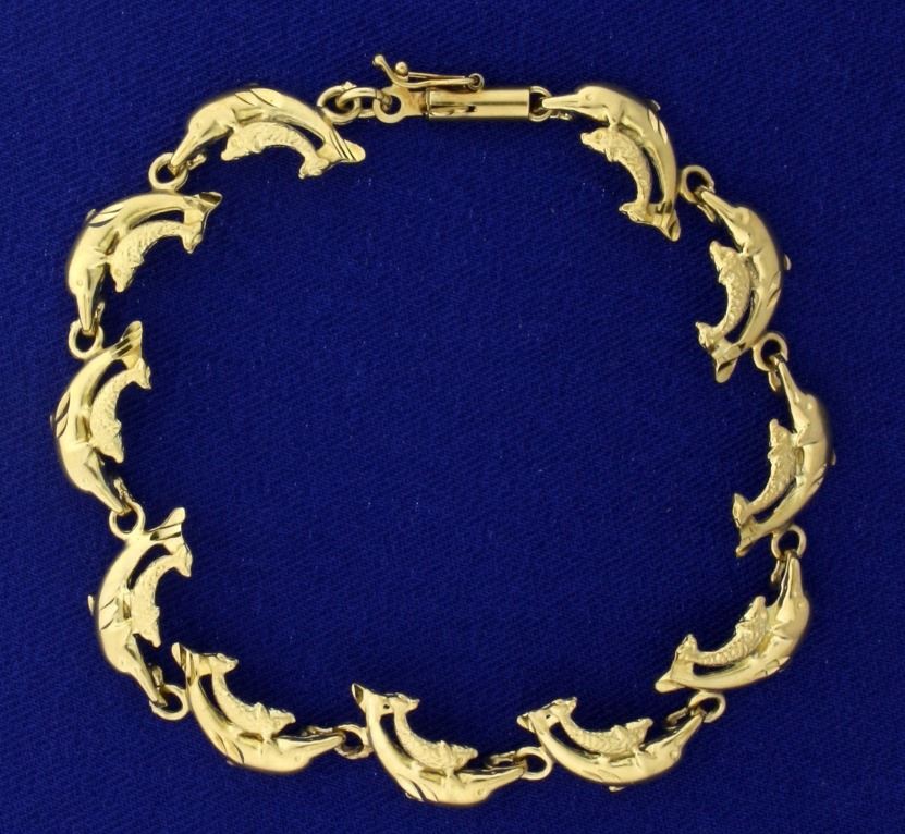 In 10k yellow gold. 7 inches long and 10mm wide with safety clasp. 8.4g.