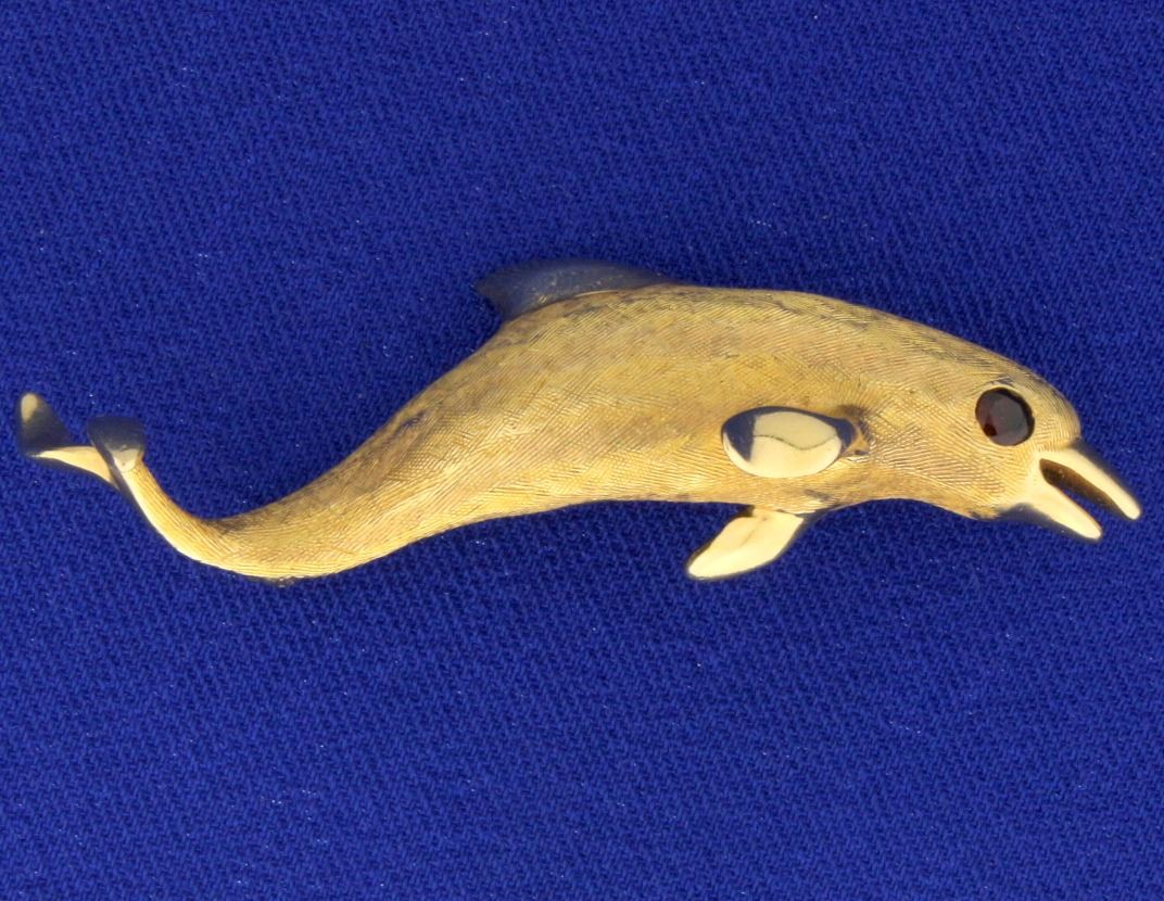 In 14k yellow gold, containing a 3mm garnet as an eye. 2 inches long. 11.5g.