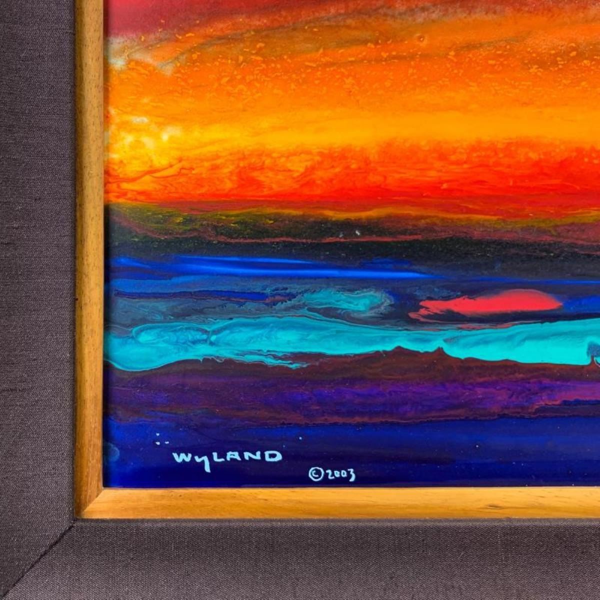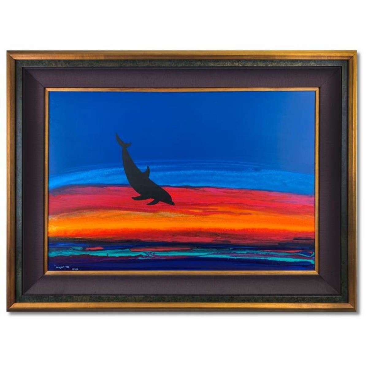 "Dolphin Rising" is an original Original Painting painting on Board by Wyland that is hand signed and comes with a certificate of authenticity. The frame is imperfect with moderate wear. Measures approximately 46" x 34" (framed), 36" x 24" (image).