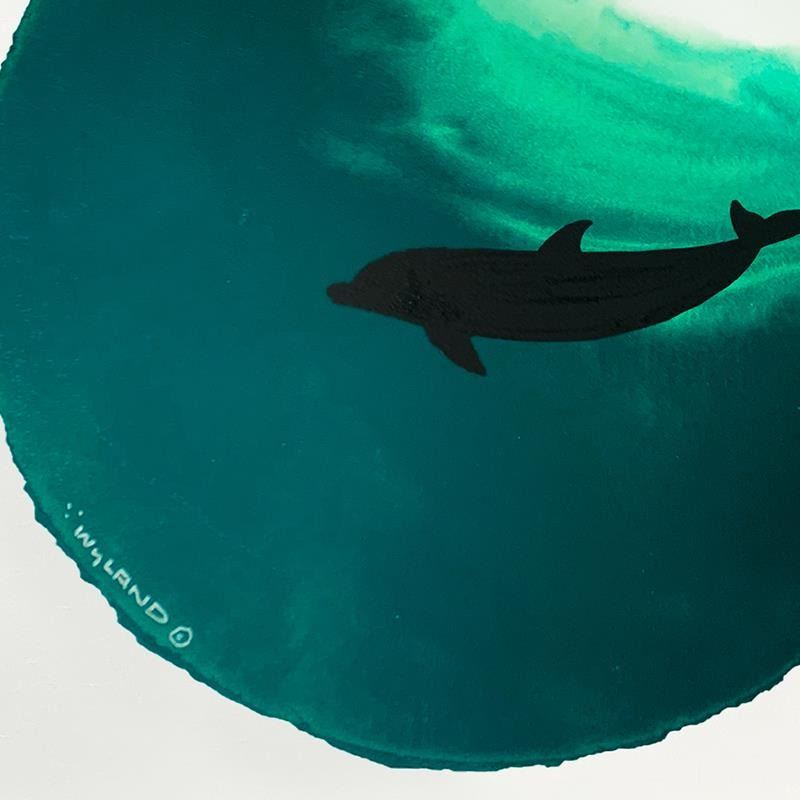 "Dolphin Swimming Deep" is an original painting, watercolor on deckle edge paper by Wyland. Hand signed by the artist, the piece comes custom framed and with a letter of authenticity. Measures approximately 30" x 30" (framed), 19.5" x 19.5" (image).