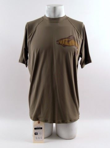 Dr. Clay Haskett (Harry Connick Jr.) screen worn, hero, brown short sleeve with tan fish on the front and back 'Wet Effect' rashguard. (size XL) Includes wardrobe tag!