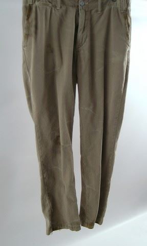 Reed Haskett (Kris Kristofferson) screen worn, hero, beige checker print with oil stains short sleeve 'Italia' collared shirt, olive green distressed 'Earth Creations' t-shirt, (size M) and camel distressed with oil stain 'Polo' pants. (size 33/30) Includes wardrobe tag!