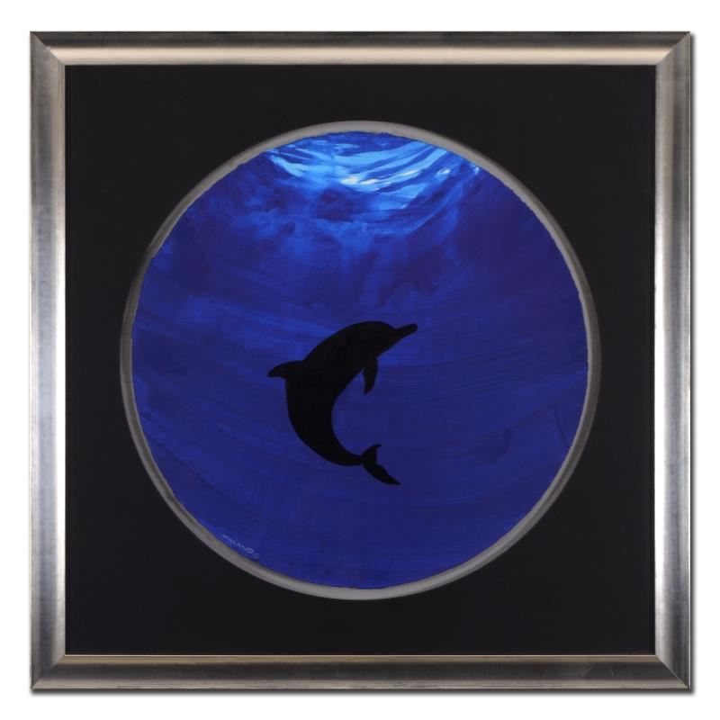 "Dolphin (Blue)" is an original watercolor painting on round cut deckle edge paper by Wyland, hand signed by the artist. This piece is custom framed. Includes Certificate of Authenticity. Measures approx. 28.5" x 28.5" (frame), 19.5" (image diameter).
