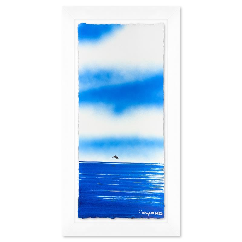 "Dolphin" is an original painting acrylic on deckle edge paper by Wyland. Hand signed by the artist, the piece comes custom framed and with a letter of authenticity. Measures approximately 26.5" x 14.5" (framed), 22.5" x 10.5" (image). This item requires special handling and may have a longer than usual turnaround