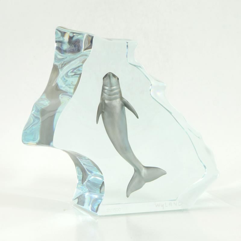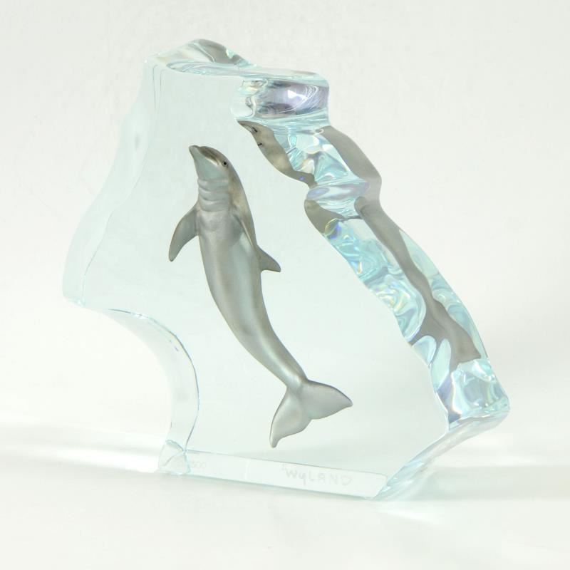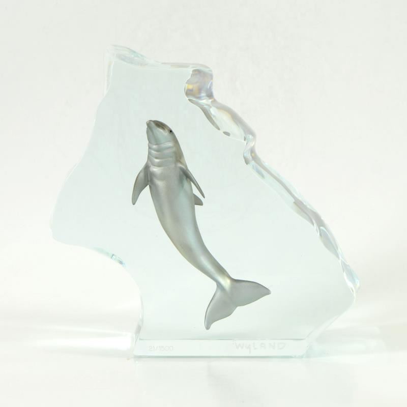 "Dolphin" is a limited edition lucite sculpture, numbered and bearing Wyland's official signature. Includes Certificate of Authenticity. Measures approx. 8" x 3" x 8"; 5 lbs. (weight).