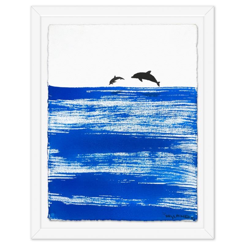 "Dolphins Jumping" is an original sumi ink painting on paper by Wyland, hand signed by the artist. This piece comes custom framed. Includes Letter of Authenticity. Measures approx. 37" x 30" (frame), 30" x 23" (image). This item requires special handling and may have a longer than usual turnaround.