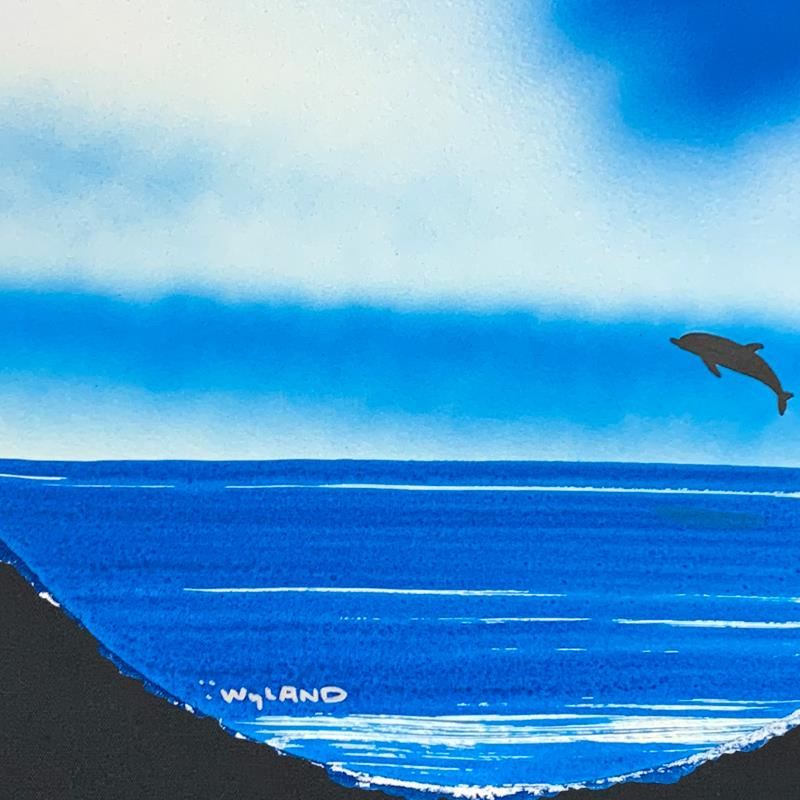 "Dolphins" is an original painting, watercolor on deckle edge paper by Wyland. Hand signed by the artist, the piece comes custom framed and with a letter of authenticity. Measures approximately 30" x 30" (framed), 19.5" x 19.5" (image). This item requires special handling and may have a longer than usual turnaround.