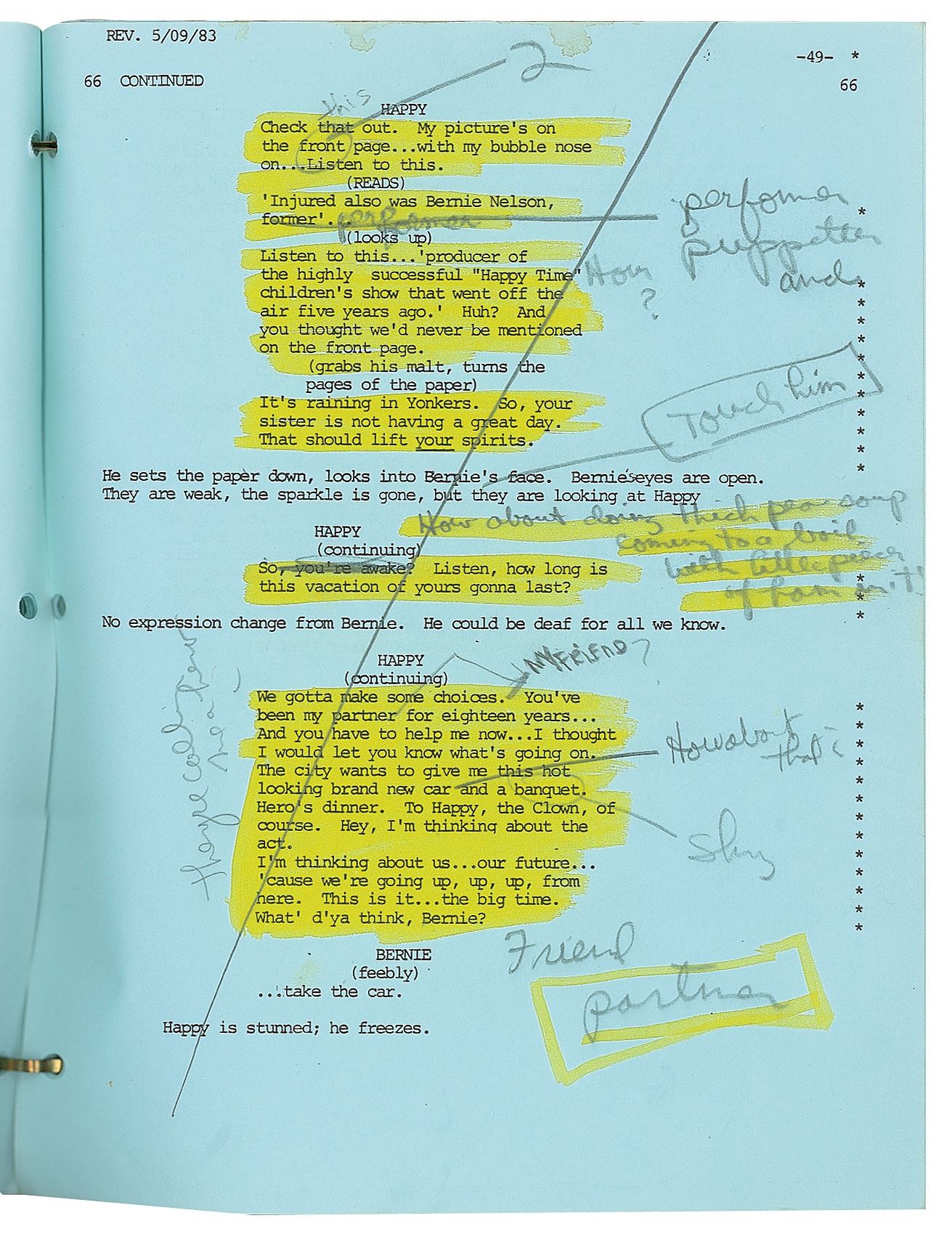 Dom DeLuise's personally-owned and -used brad-bound revised final draft screenplay for the 1983 made-for-television movie Happy, 105 pages, 8.5 x 11, signed on the front cover in black felt tip, "Keep 'happy' & love, Dom Deluise, '86, xx," who adds a heart and face sketch. The back cover and inner pages are copiously highlighted and annotated in pencil and ballpoint by DeLuise. In fine condition, with soiling and handling wear from use.
