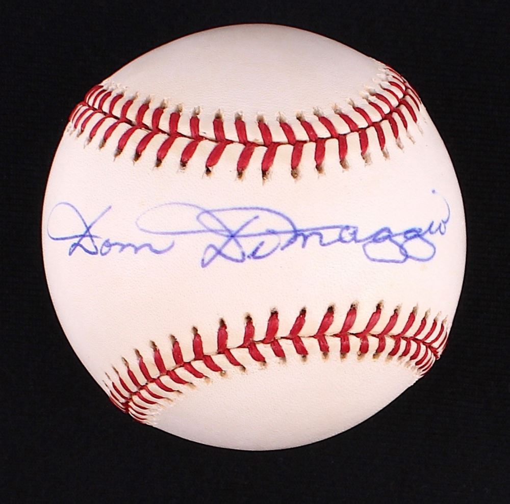 Official American League Baseball. Hand-signed in blue ink pen by Dom DiMaggio (Red Sox). The autograph includes an official Stacks of Plaques - Est. 1985, celebrating 30 years in the business - hologram and matching COA for authenticity purposes.