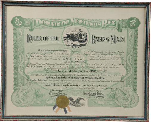 Domain of The Neptunus Rex Signed U.S.N. Ruler of The Raging Main Certificate in Frame, dated January 24th, 1921 w/ gold seal - 23" x 18"