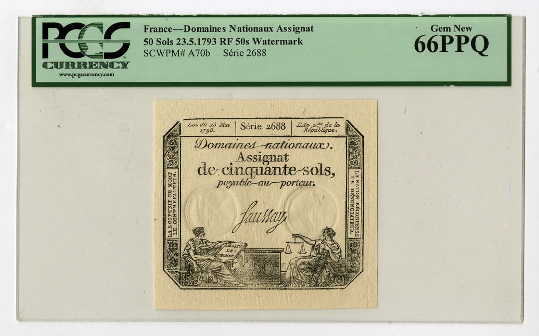 France, 1793. 50 Sols, P-A70b, Issued Banknote, Black printing with allegorical women at bottom left and right, Serie 2688, PCGS graded Gem New 66 PPQ.