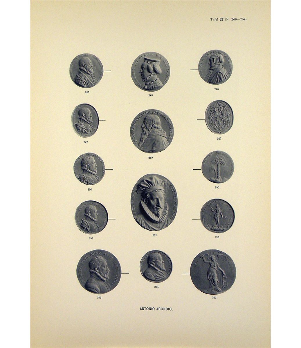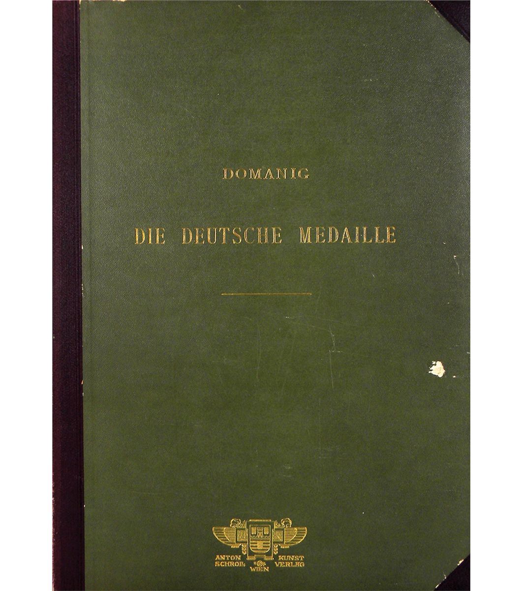 Domanig, Karl. DIE DEUTSCHE MEDAILLE IN KUNST- UND KULTURHISTORISCHER HINSICHT, NACH DEM BESTANDE DER MEDAILLENSAMMLUNG DES ALLERHÖCHSTEN KAISERHAUSES. Vienna: Anton Schroll, 1907. Two volumes. Folio, original dark red cloth, green paper sides, gilt; plates housed loosely in a matching portfolio. viii, 167, (1) pages; text illustrations; 100 very fine plates. Text volume a bit worn, with joints cracking and text block loosening; plates fine. A scarce and most important work based on the collection of the Vienna Imperial Coin Cabinet; written from an artistic and historical perspective. Clain-Stefanelli 14396*. Grierson 263.