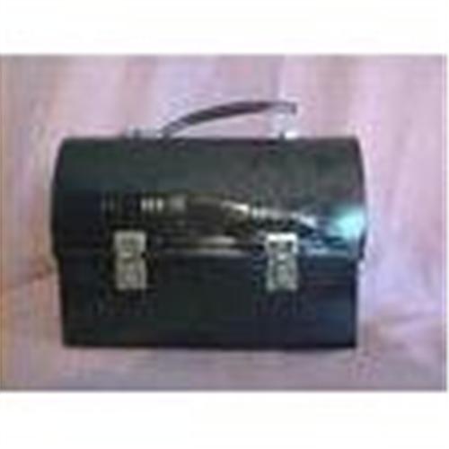 Black dome top lunch pail, made by Aladdin Industries in Nashville TN. The lunch box is in good condition with a few chips of paint loss. This dome top lunch pail measures, 10.5 inches wide and 8 inches high. Recently painted.
