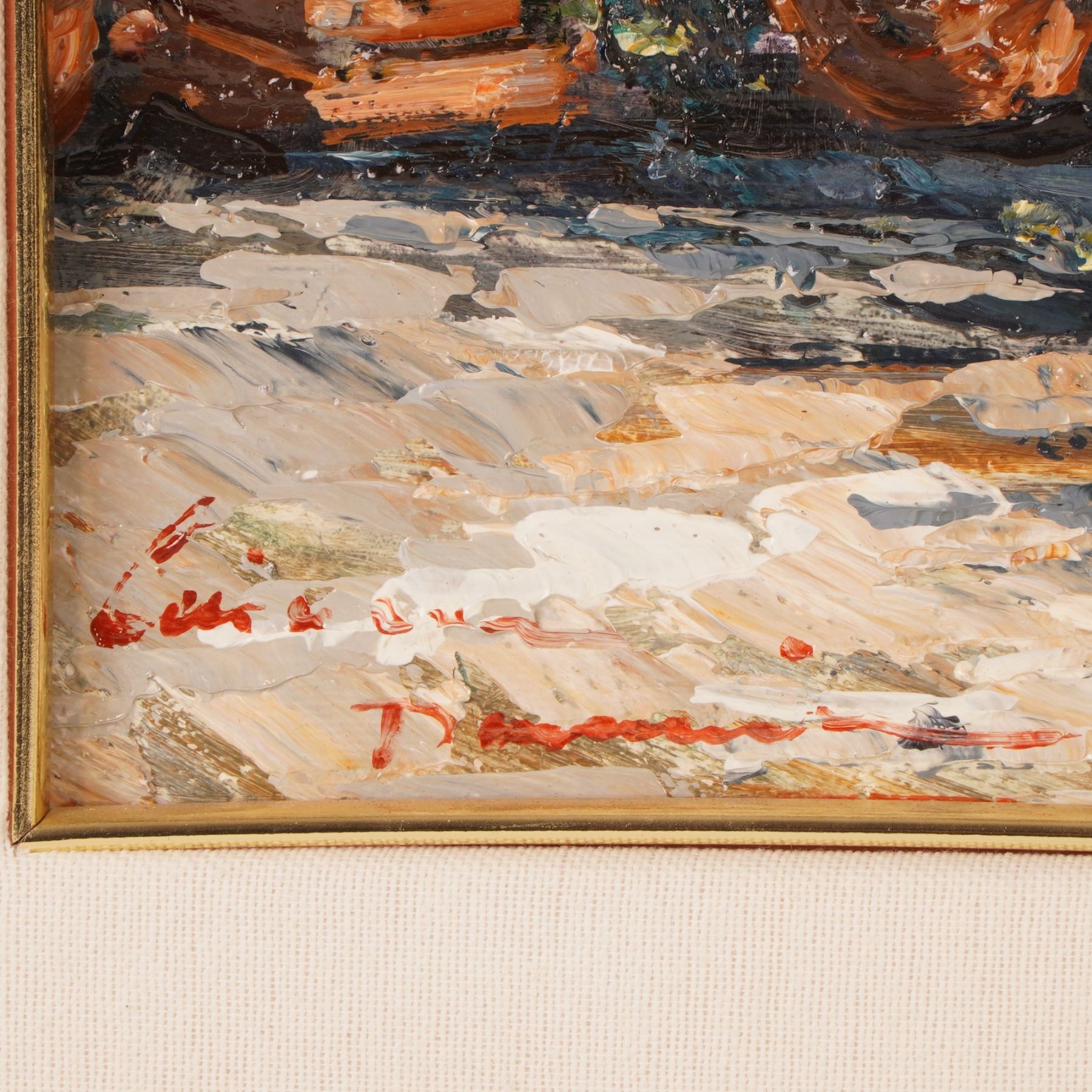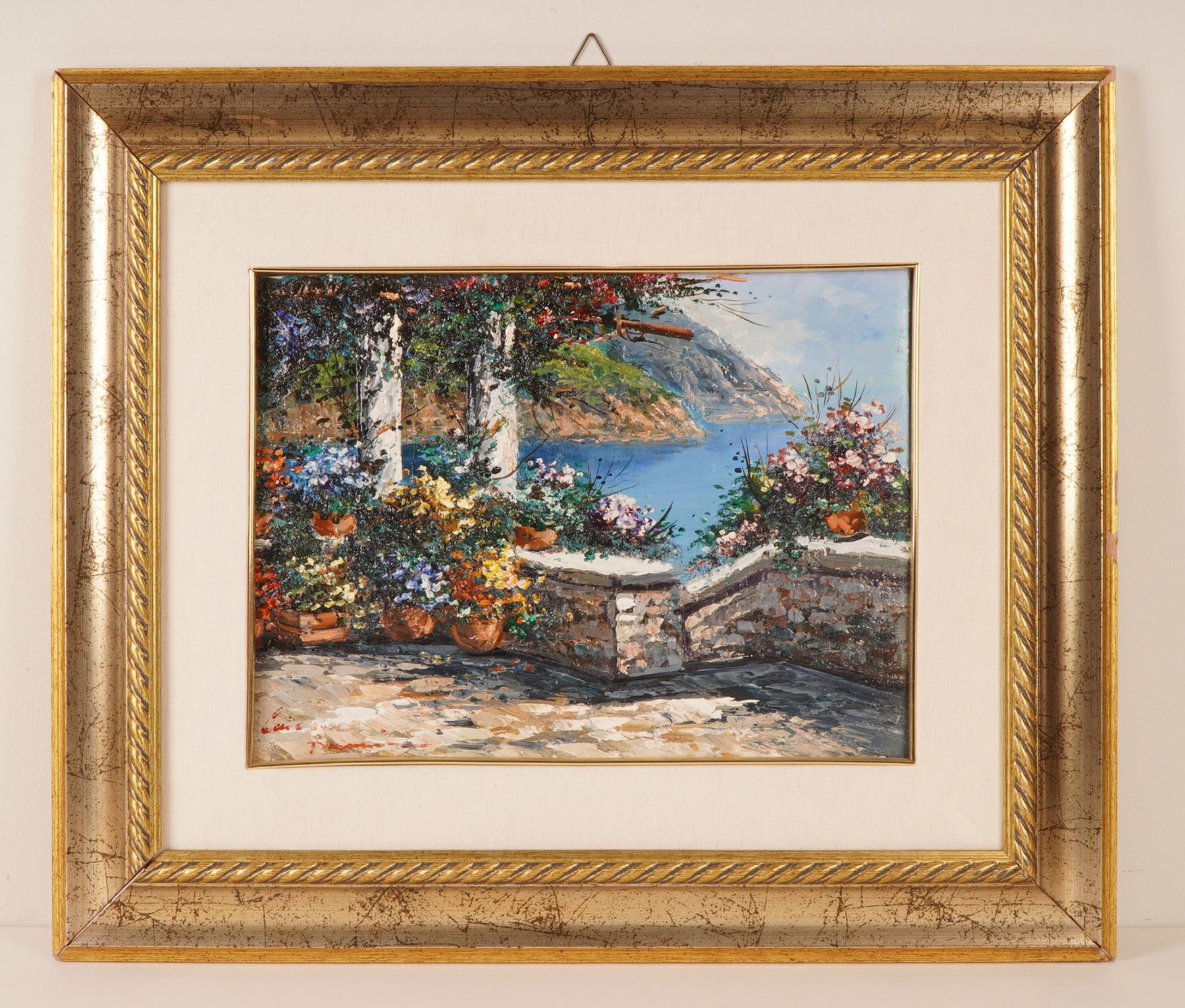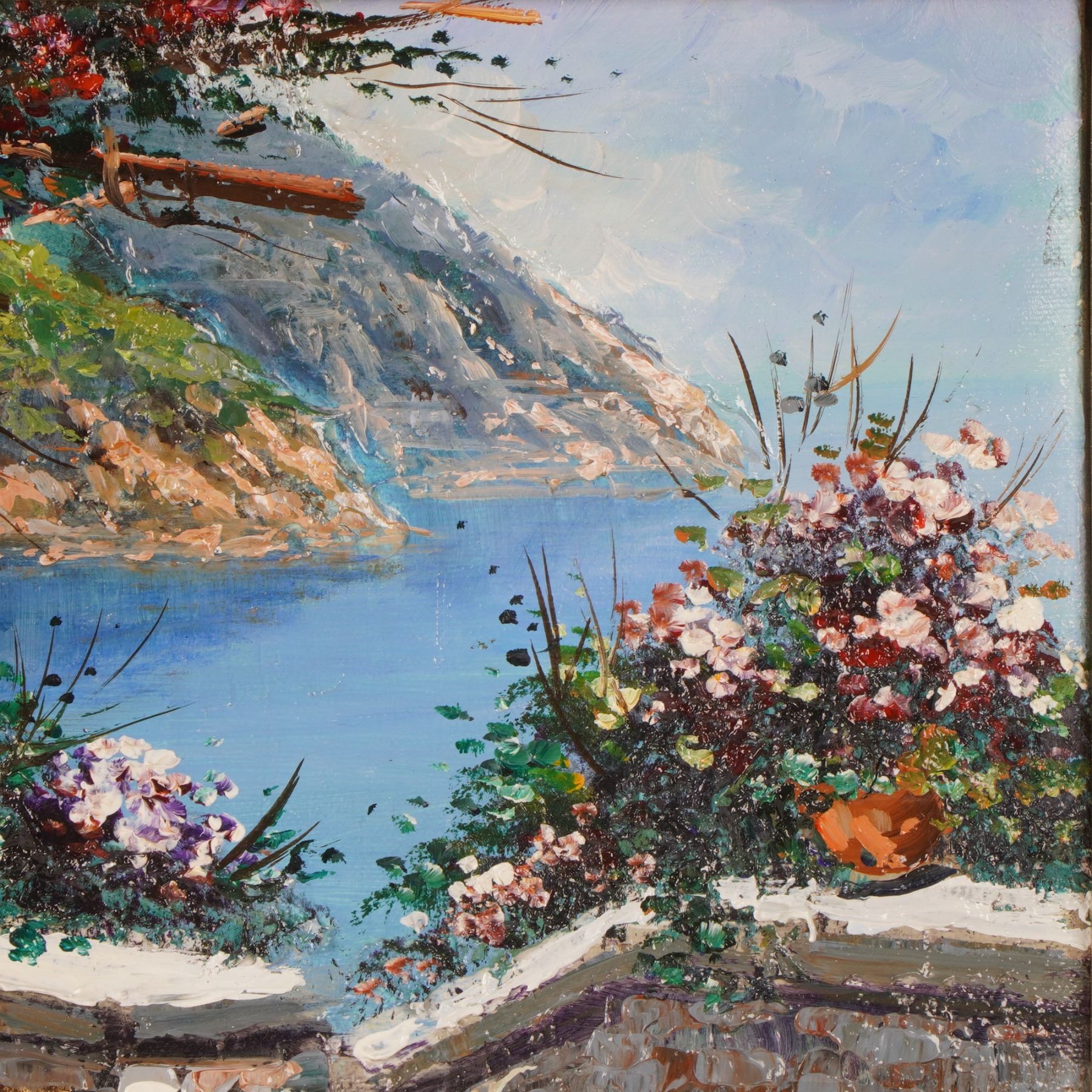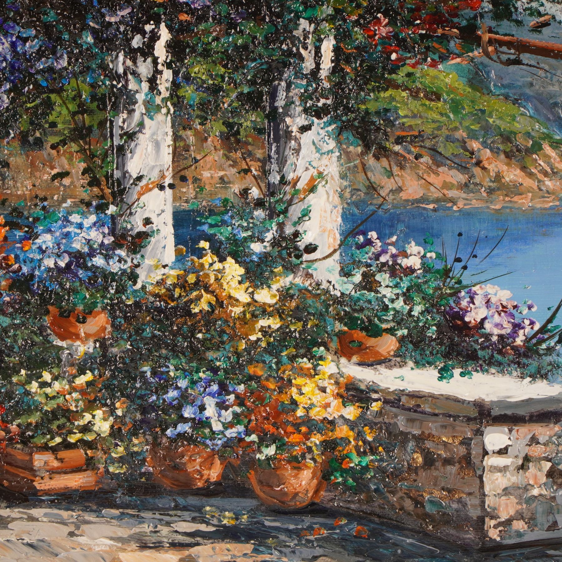 Rendered in Domenico Caiazza's signature impasto technique, this vibrant coastal terrace scene bursts with lush potted blooms, sunlit stonework, and a serene blue inlet framed by distant cliffs. The artist's lively brushwork and rich palette create a warm, inviting atmosphere that evokes leisurely days along the Italian coast. Beautifully presented in an ornate gilt frame and signed on both canvas and verso, this work is an appealing addition for collectors seeking expressive contemporary Italian landscape painting.
