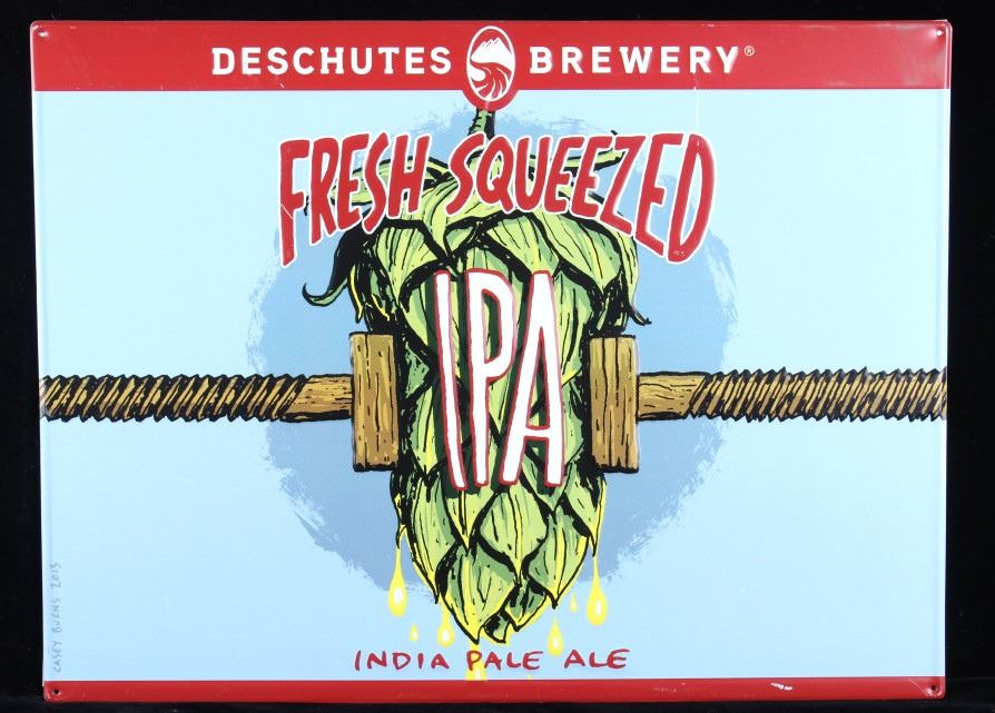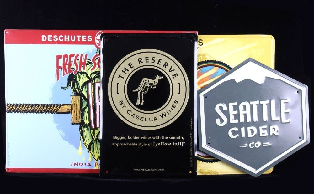 Featured in this lot is this domestic brewery and yellowtail wine sign collection. There are four signs in this collection. There first sign is a is a Seattle Cider Co. with a mountain in the background. The second sign is a Yellowtail reserve sign with a kangaroo in the center. The third sign is a Deschutes Brewery Inversion IPA with a mountain scene in the center of the sign. The last sign is a Fresh Squeezed IPA sign from Deschutes Brewery. The condition of these signs is good, with slight scratches to the face of the signs. The measurements of these signs are 15" x 14" for the Seattle Cider sign, 18" x 12" for the Yellowtail sign, 17 1/2" x 16" for the Deschutes Brewery sign, and 18" x 24" for the fresh squeeze sign.
