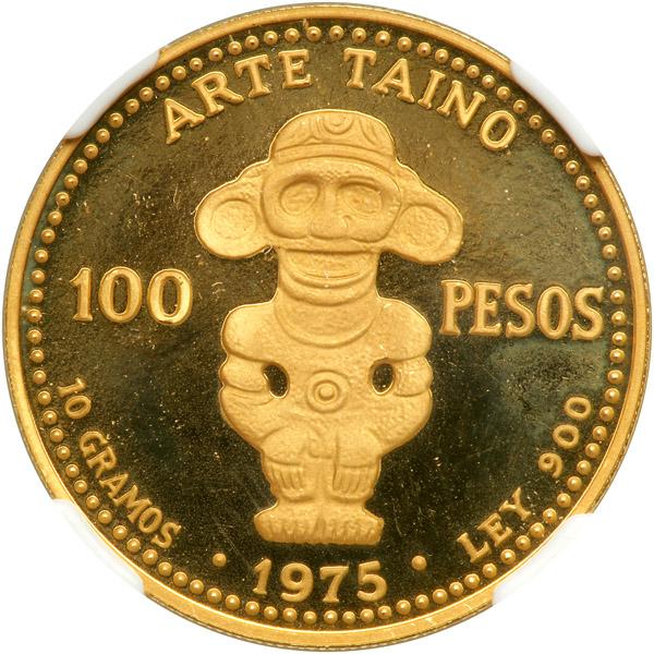 Dominican Republic. 100 Pesos, 1975. Fr-3; KM-39. Weight 0.2893 ounce. Mintage 2,000. Pre-Columbian artifact. NGC graded Proof 68 Ultra Cameo.