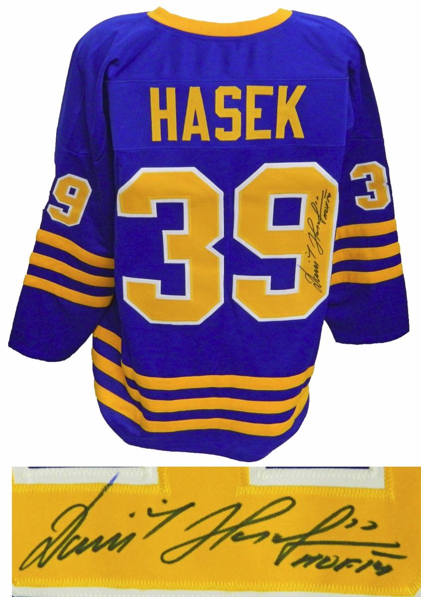 Dominik Hasek signed blue throwback custom hockey jersey 'HOF 14' inscriptions. Jersey is size X-Large and has players number on front. Item comes with a Schwartz Sports Memorabilia tamper-proof numbered hologram and Certificate of Authenticity which ca