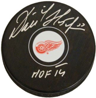 Dominik Hasek played 16 seasons in the NHL. He played for the Chicago Blackhawks, Buffalo Sabres, Detroit Red Wings and the Ottawa Senators. From 1993 to 2001, he won six Vezina Trophies. In 1998 he won his second consecutive Hart Memorial Trophy, becoming the first goaltender to win the award multiple times. While with the Red Wings in 2002, Hasek became the first European-trained starting goaltender to win the Stanley Cup. In the process, he set a record for shutouts in a postseason year.Dominik Hasek has hand signed this Detroit Red Wings Hockey Puck with HOF 14 Inscription. Schwartz Sports Hologram and Certificate of Authenticity from Athlon Sports.