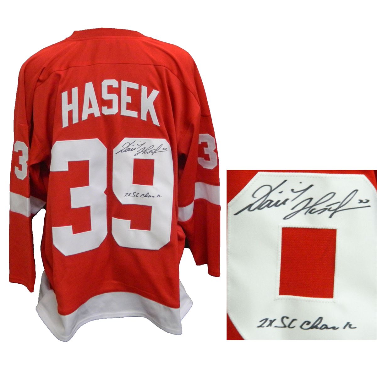 Dominik Hasek signed red custom hockey jersey '2x SC Champ' inscription. Jersey is size X-Large and has a blank front. Item comes with a Schwartz Sports Memorabilia tamper-proof numbered hologram and Certificate of Authenticity which can be verified online.
