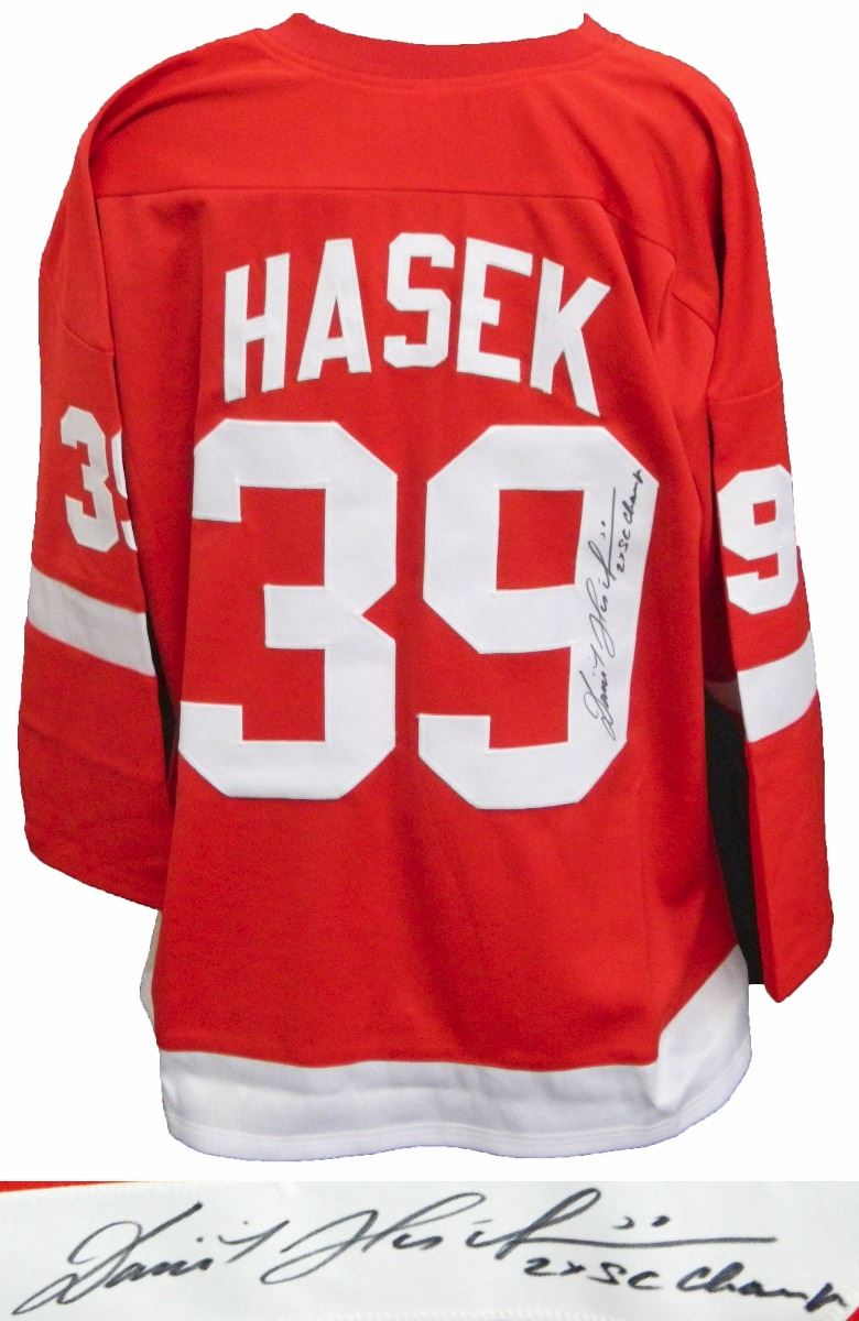 Dominik Hasek signed red custom hockey jersey '2x SC Champ' inscription. Jersey is size X-Large and has players number on front. Item comes with a Schwartz Sports Memorabilia tamper-proof numbered hologram and Certificate of Authenticity which can be verified online.