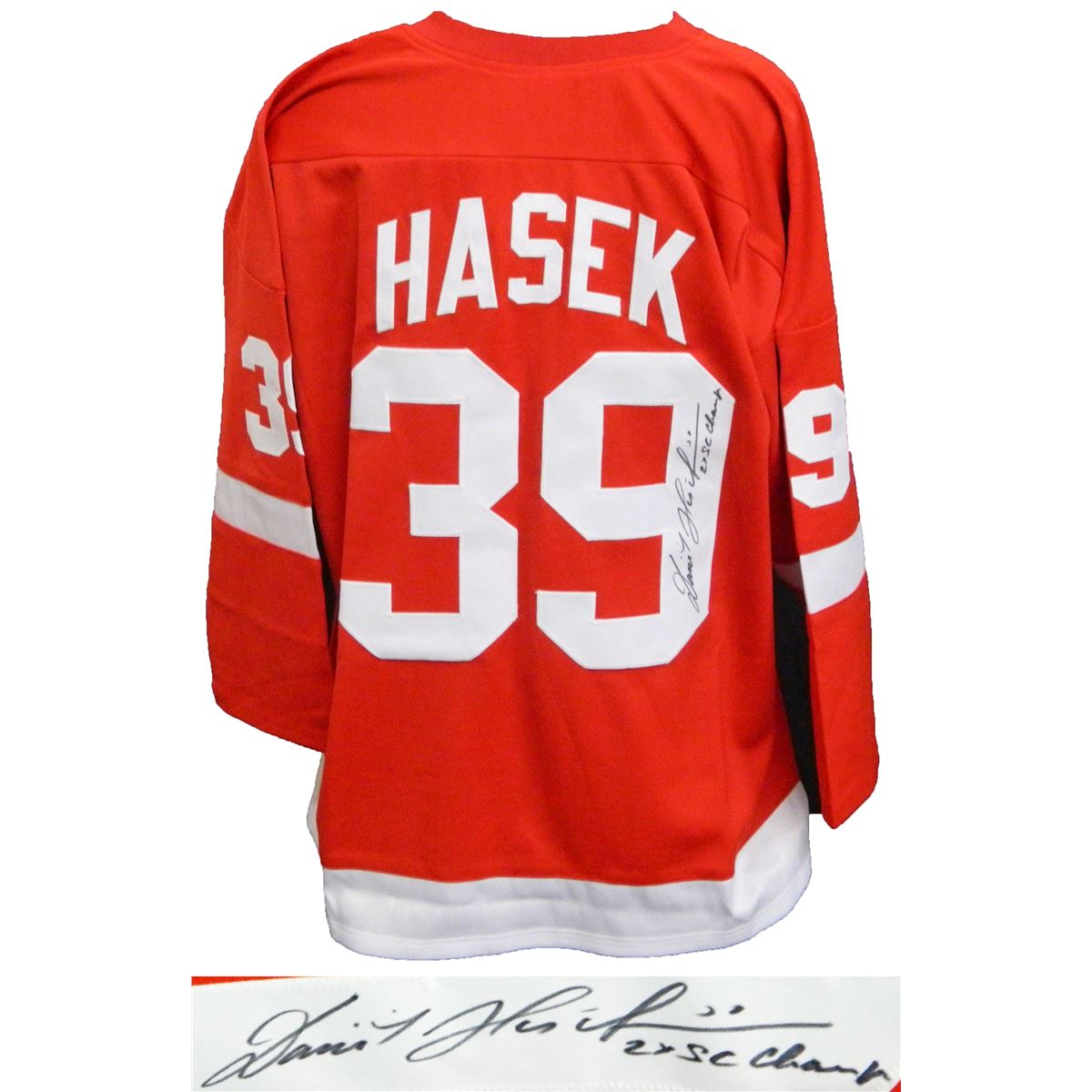 Dominik Hasek signed red custom hockey jersey '2x SC Champ' inscription. Jersey is size X-Large and has players number on front. Item comes with a Schwartz Sports Memorabilia tamper-proof numbered hologram and Certificate of Authenticity which can be verified online.