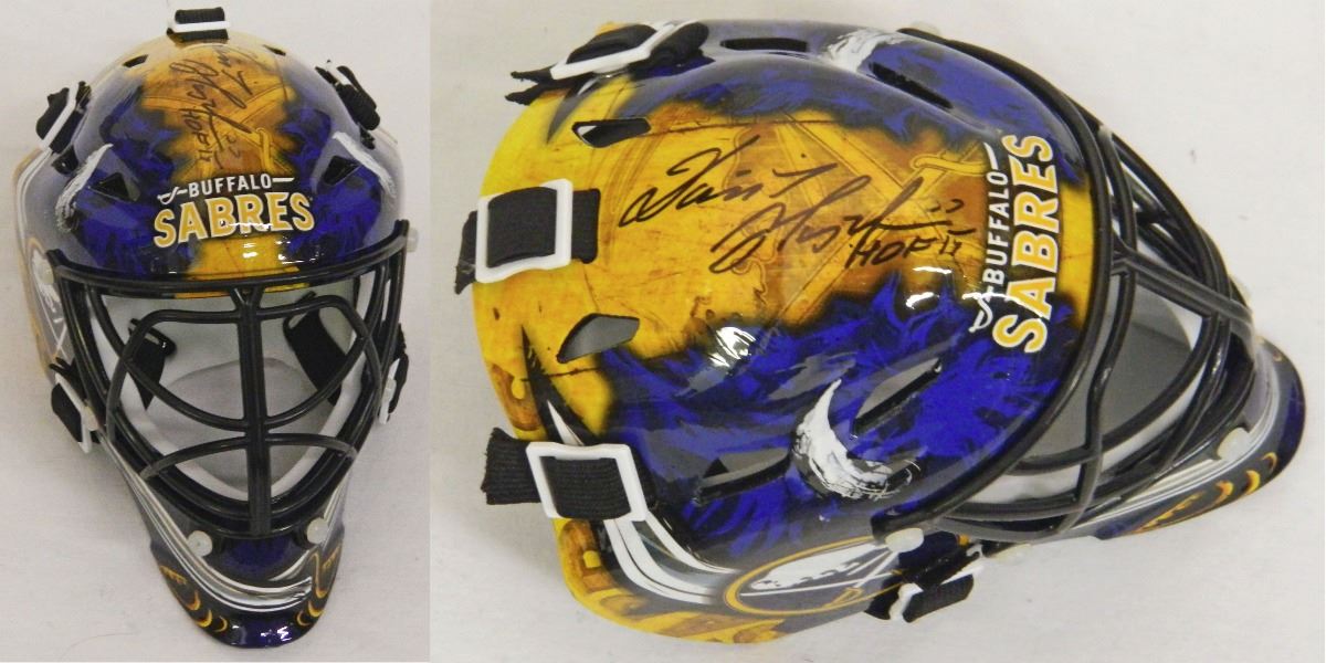 Dominik Hasek signed Buffalo Sabres Franklin mini hockey goalie mask with 'HOF 14' inscription. Item comes with a Schwartz Sports Memorabilia tamper-proof numbered hologram and Certificate of Authenticity which can be verified online.
