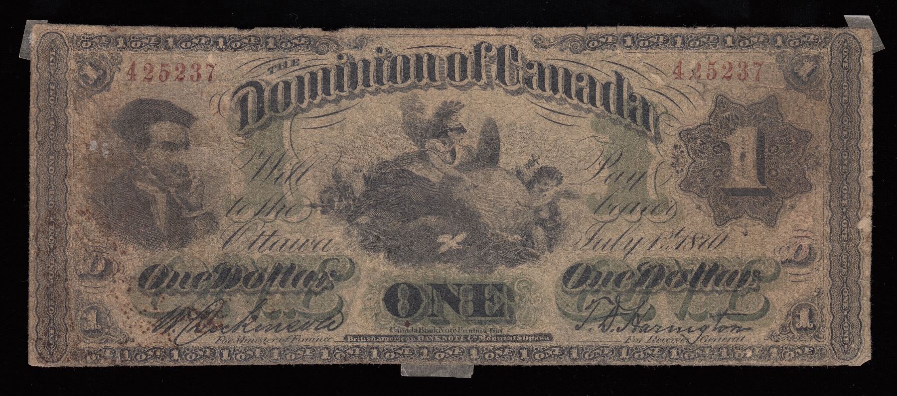 Dominion of Canada, One Dollar, 1870, Small Date, Payable at Toronto, DC-2b-CFT, smaller red SN 425237, check letter "D". Block letter machine overprint "COUNTERFEIT" twice on back, in purple. VG, some rust and evidence of mounting on back. A few border nicks and minor tears.