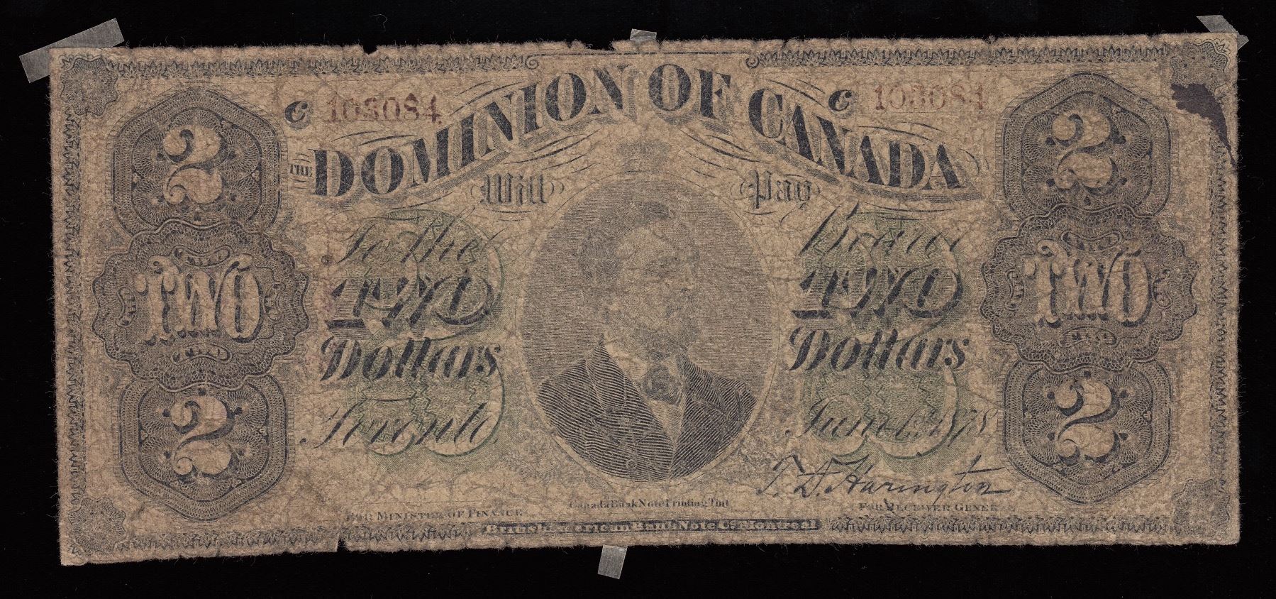 Dominion of Canada, Two Dollars, 1878, Payable at Toronto, DC-9b-CFT. Smaller red SN 103084, check letter "C". Machine overprint, in script, "COUNTERFEIT" twice on back, in purple. Overall About Good, with border nicks and chinks and evidence of hinge mounting on back.