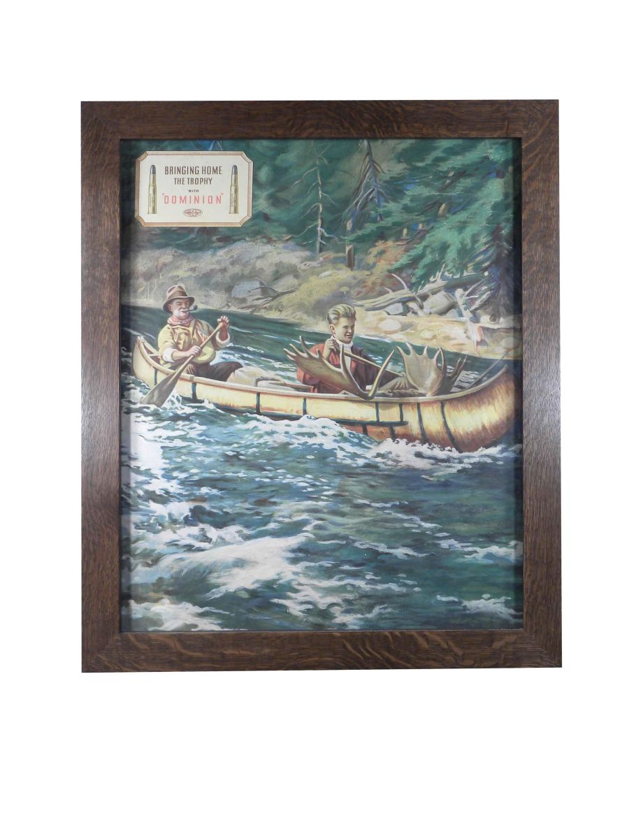 Dominion Ammunition Paper Poster, depicting man and his son in a canoe. Period oak frame, excellent condition. 24 X 29 inches overall.