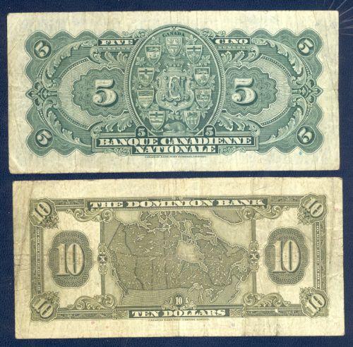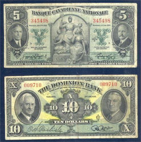 The Dominion Bank; $10.00 1938, VF, serial 009710, Charlton number 220-28-04. Banque Canadienne Nationale; $5.00 1935, VF, serial 345498, Charlton number 85-12-02. Lot of 2 notes.