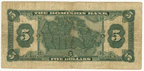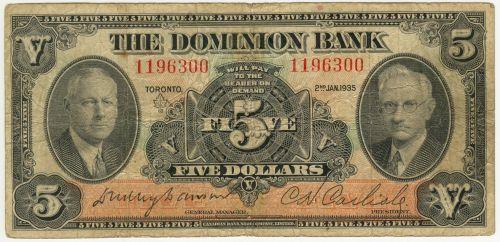 Dominion Bank $5.00 note 1935 in Fine, 220-26-02, serial 1196300.