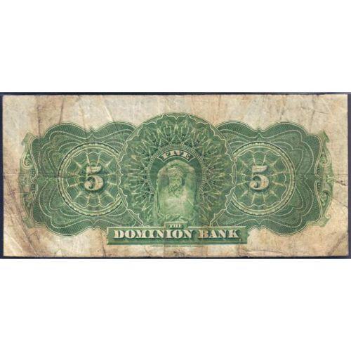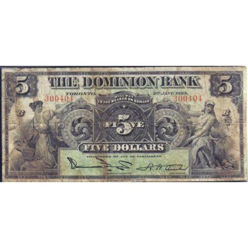 The Dominion Bank Five Dollars 1925, Bogert-Austin, CH 220-16-14, Serial Number 300404 B, PMG Very Good 10. Some staining, particularly on the back