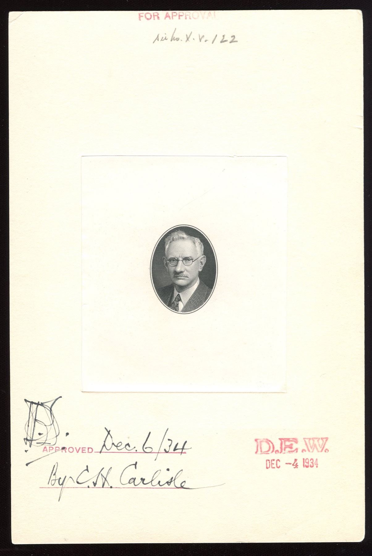 "Prince Arthur", as found on the 1871 $4; Approval proof on card, C. A. Bogert, on 1931 issue notes. C. H. Carlisle, approval proof on full card, on 1935 issue notes, appears to bear Carlisle's manuscript signature. Moreover, a notation on the back of the card reveals the engravers involved. Lot includes two almost identical vignettes of the Head Office 1879 - 1914, V-46 and V-46a, engraved by Dominion Bank Note Co. They differ in presence or absence of the flag at the top of the building. The two portraits are in excellent condition, the building vignettes are cut down and have minor damage and soiling. Finally, a piece of engraved text with the bank name etc., possibly intended for a cheque.