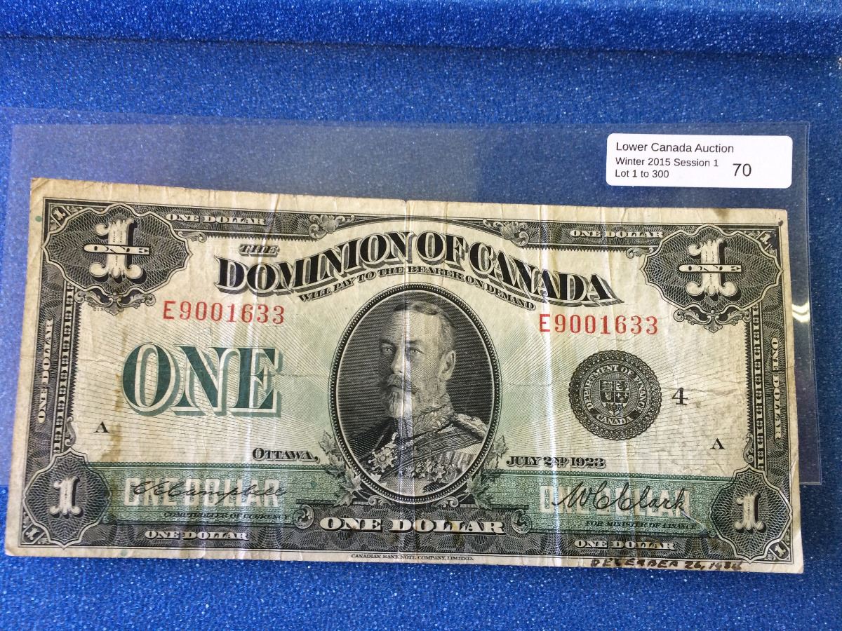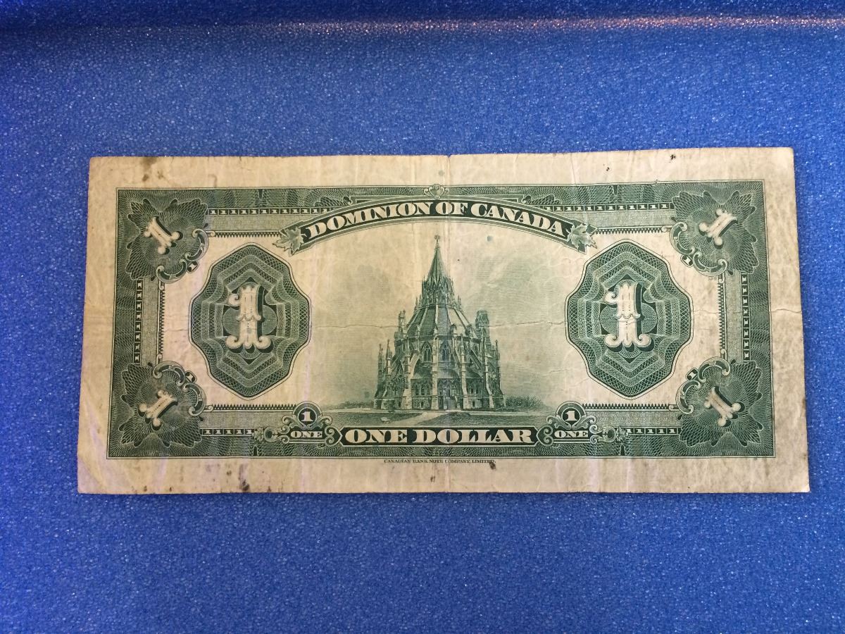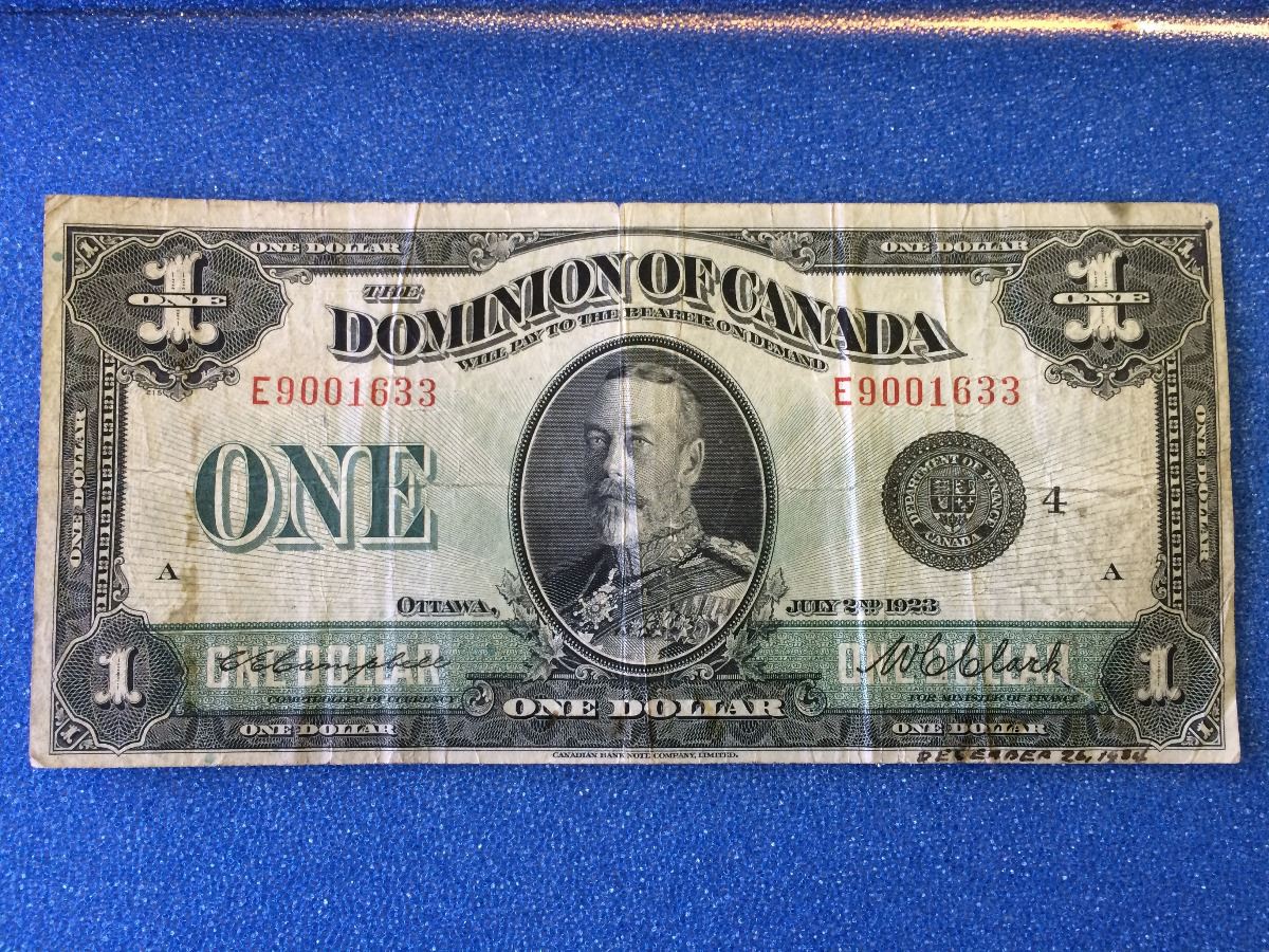 Dominion of Canada; $1.00 note 1923 DC-25o E9001633 Fine with writing in lower right margin.