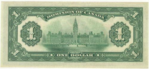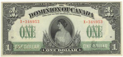 Dominion of Canada $1.00 note 1917 in Almost Uncirculated, DC-23b, Saunders, no Seal, serial X-348953.